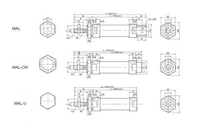 | Bore | A | A1 | B | C | E | F | G | H | I | J | K | L | M | U | V | W | X | AR | AX | AY | T |